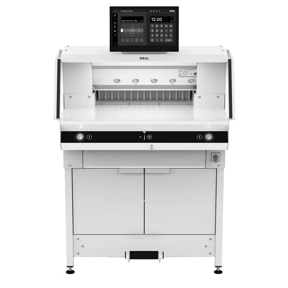 Electro Mechanical Precision Blade Drive and Hydraulic Clamp Drive. This Ideal’s best programmable paper cutter.